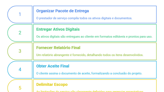 A conclusão do trabalho é marcada pela entrega formal de todos os ativos digitais desenvolvidos e pela validação final do cliente. Este momento é crucial, pois formaliza o encerramento do projeto e garante que a empresa tenha em mãos todos os arquivos necessários para utilizar os novos materiais de forma autônoma e estratégica.