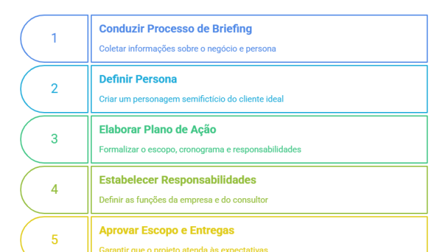 Com as informações do briefing em mãos, o consultor elabora o Plano de Ação. Este documento formaliza o escopo do trabalho, estabelece um cronograma com as atividades e agendas, e define claramente os responsáveis por cada etapa, tanto da parte da empresa quanto do prestador de serviço.