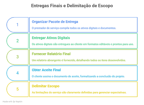 Após a criação e aprovação desses ativos digitais, o projeto segue para a entrega formal, marcando a conclusão do trabalho de desenvolvimento e o início da sua aplicação prática pela empresa.